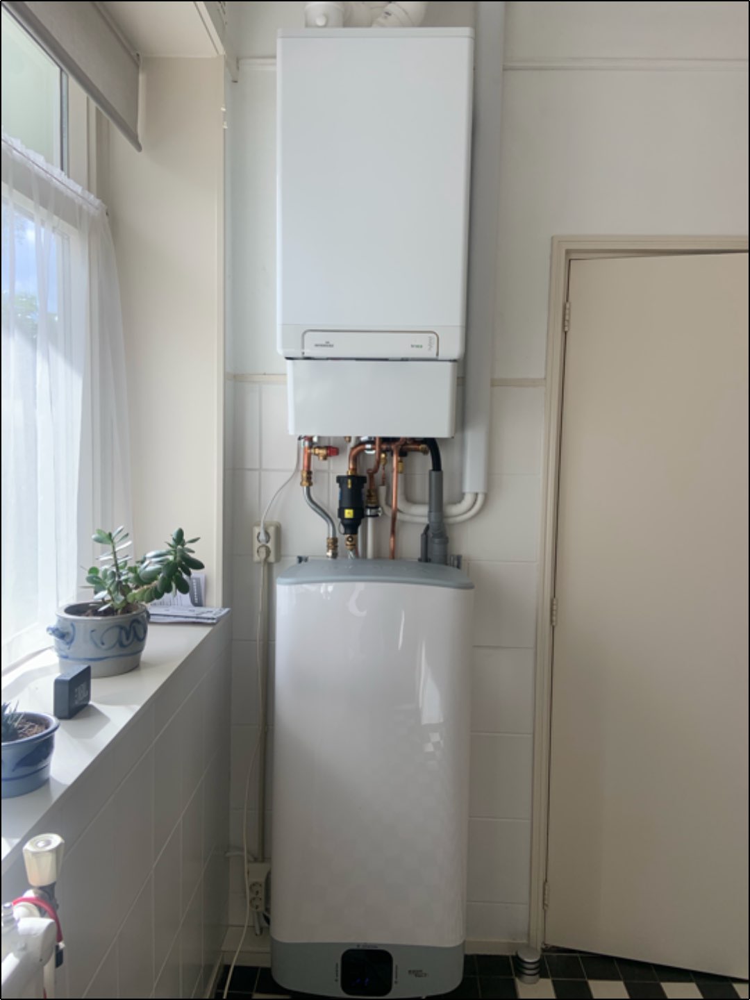 In Engelen zit een Daikin hybride warmtepomp die samen met de intergas cv ketel de woning verwarmt. Een tijd geschakelde electrische boiler zorgt voor de voorverwarming van het warm water.